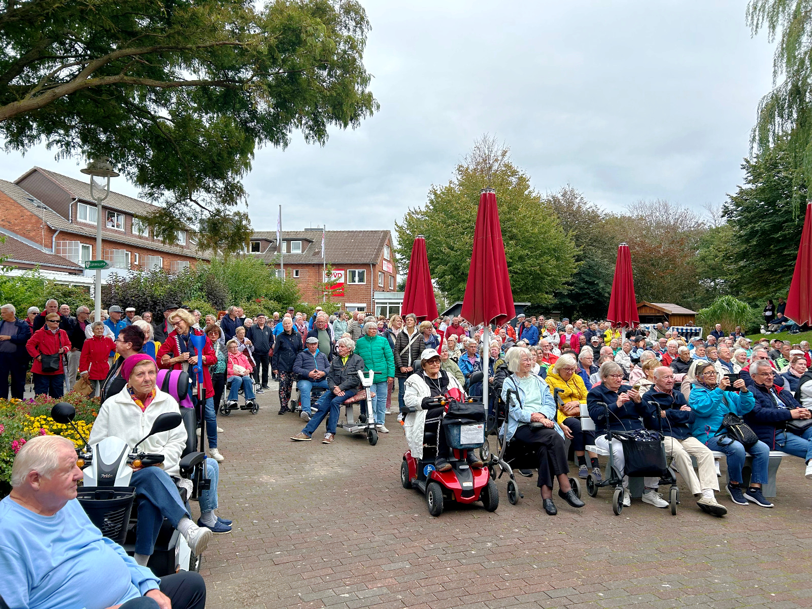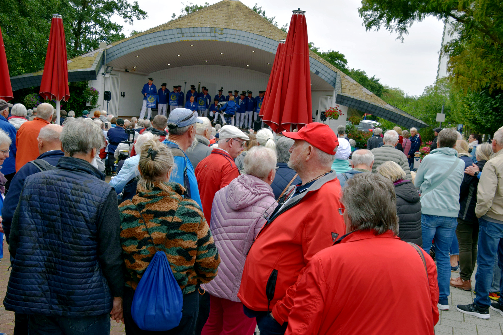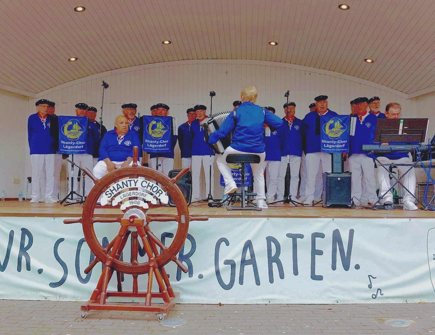 Der Himmel war bewölkt und es blieb trocken. Ein herrliches Bild bot sich von der Bühne aus. Jeder von uns Aktiven gab sein Bestes. Unser erster Vorsitzende Wolf sagte die Lieder an und schmückte sie mit ein paar Döntjes aus. „Auch wenn vom blauen Himmel nichts zu sehen ist, singen wir trotzdem das Lied „Über uns der blaue Himmel.“ Was gut ankam. Der lange Applaus und die fröhlichen Gesichter zeigten uns, dass wir mit unserer Liederauswahl richtig lagen.